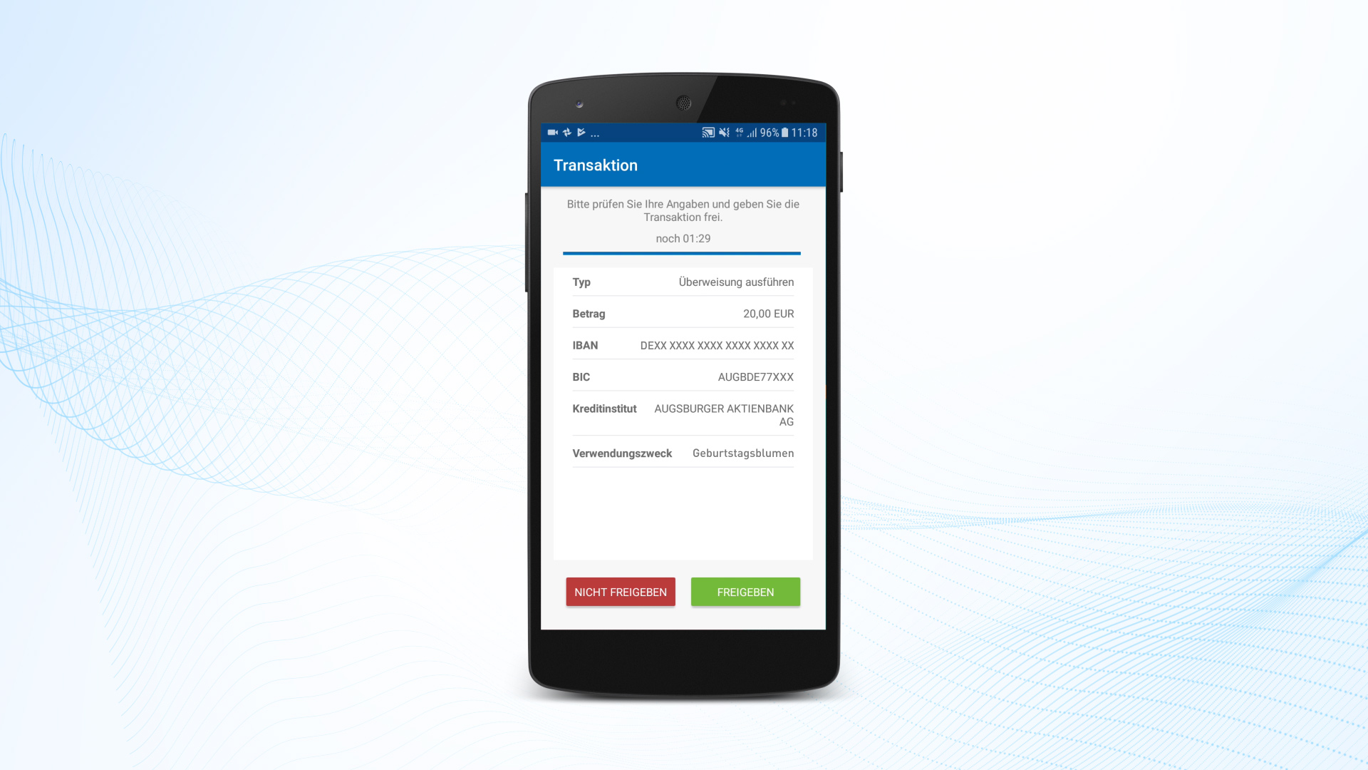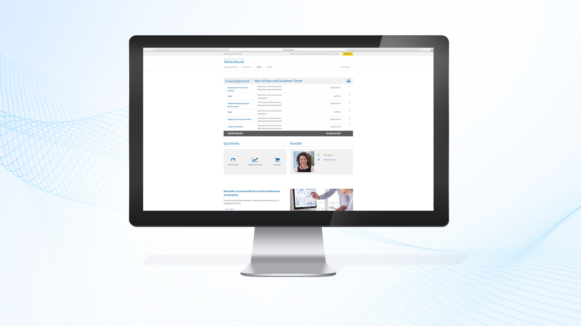 Für die Logoanimation griffen wir klassische Designelemente der AAB Welt auf, übersetzten diese jedoch in einen moderneren Stil. Die klassischen Guillochen vor Weiß stellten wir als Wellen dar, die durch ihre fließende Bewegung Anmut und Ruhe ausstrahlen. Das Logo entsteht aus einer Prägung und erhält durch seinen 3D-Glanzeffekt eine sehr hochwertige Optik. Die Musik ist eine Mischung mehrerer Instrumentallayer, die sich zu einem Finale hin steigern und die Kraft der Marke »Augsburger Aktienbank« unterstreichen.